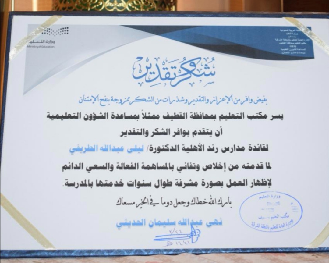 استقالة مديرة ”رند“ بحضور شخصيات قيادية في تعليم القطيف