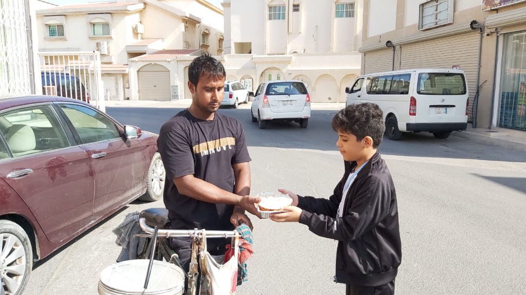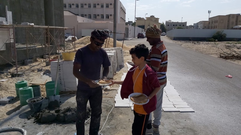وجال الطلاب الخمسة مع معلميهم شوارع المدينة الخميس الماضي وقدموا وجبات الإفطار المتنوعة ليبقى الأثر الطيب في نفوس هذه العمالة تجاه المجتمع .