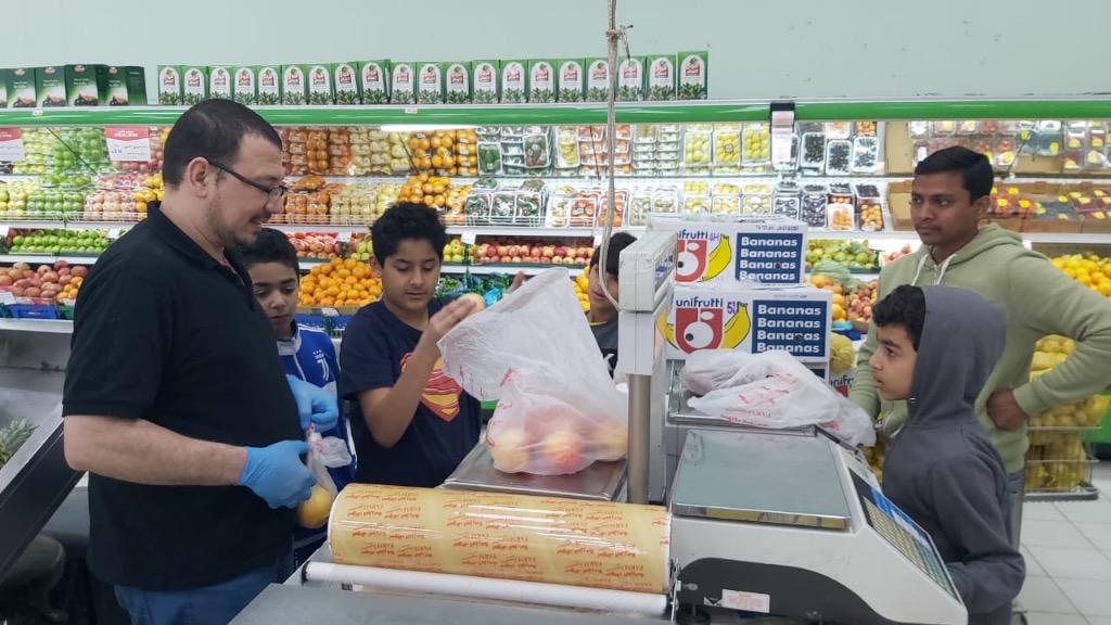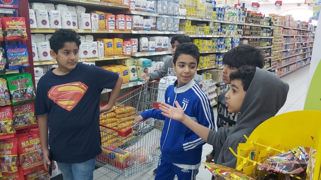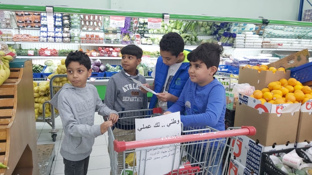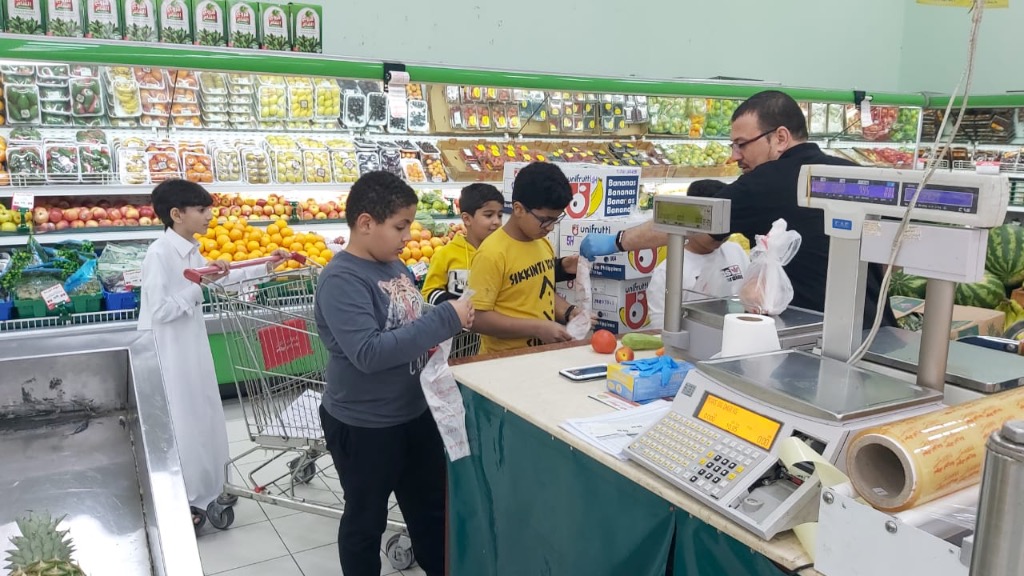 وقضى طلبة مدرسة اليرموك الإبتدائية نحو 150 دقيقة في التدرب على مهارات التسوق فيما تولى أولياء الأمور عملية الإرشاد والتوجيه للطلبة.