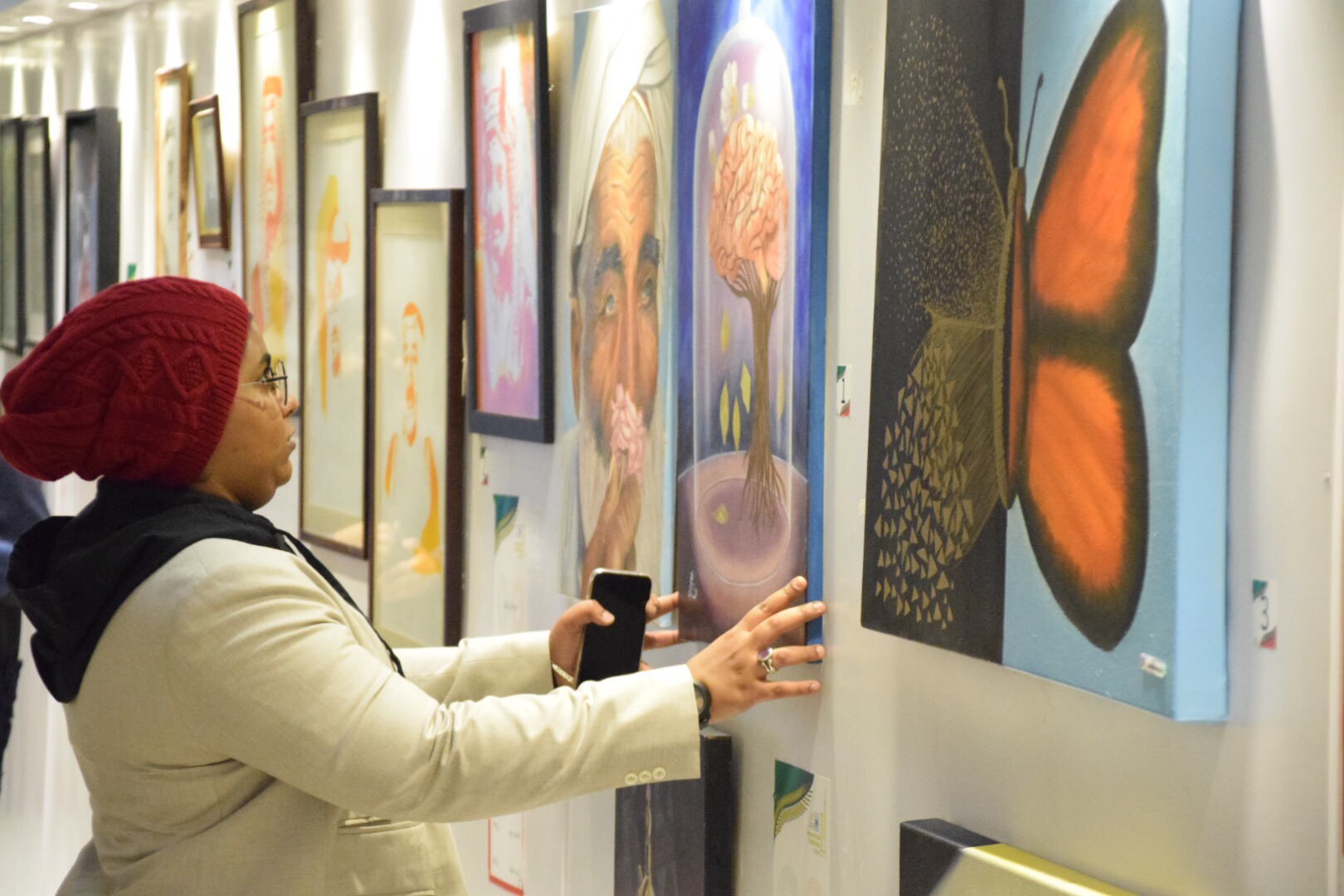 وشاركت الفنانة البحرينة فاطمة العجمي بثلاث لوحات الأولى سيريالية وعنوانها ”شجرة حياة“ ويظهر فيها صورة لدماغ ينبت منه العشب إلا أنه محتجز داخل زجاج، في دلالة إلى ”تغليب حالة العقلانية والتي ستساعد في كسر الحاجز“.