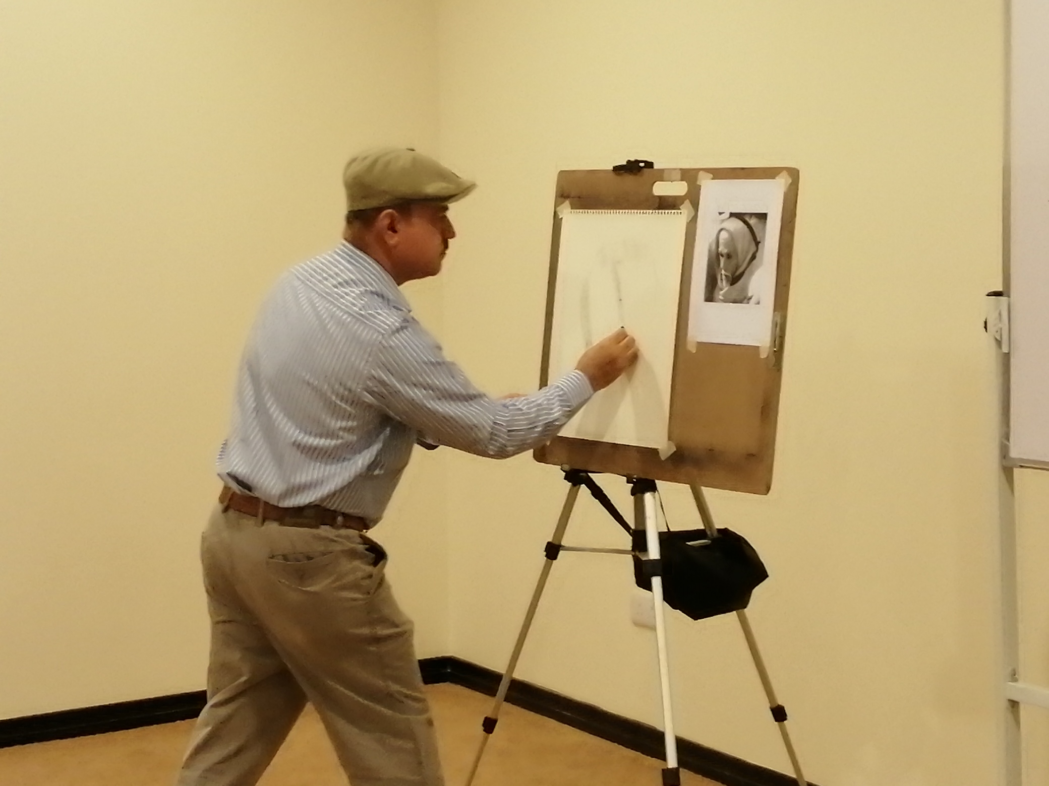 واختتمت الزيارة بورشة عمل للفنان سلمان الأمير تضمنت إعطاء الحضور فكرة عن رسم الشخصيات «البورترية» عن طريق استخدام الفحم بحيث تبرز ملاح الصورة وجماليتها.