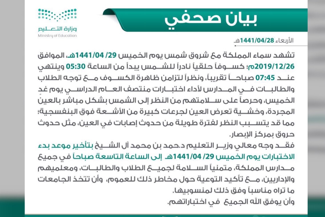 وجه وزير التعليم الدكتور حمد بن محمد آل الشيخ بتأخير اختبارات الطلاب والطالبات في جميع مدارس المملكة، غدًا الخميس، إلى الساعة التاسعة صباحاً؛ بسبب ظاهرة كسوف الشمس، حرصاً على سلامتهم ومنسوبي المدارس، كما وجه الجامعات بما تراه مناسباً حيال ذلك.