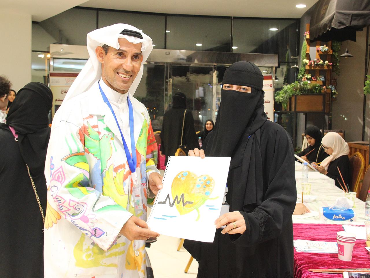 والى جانب ذلك أقامت مرسما مفتوحًا أمام الجمهور لممارسة الرسم وايصال رسائل صحية من خلال حسهم الفني.