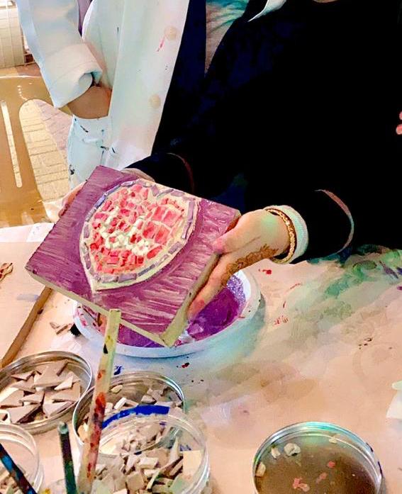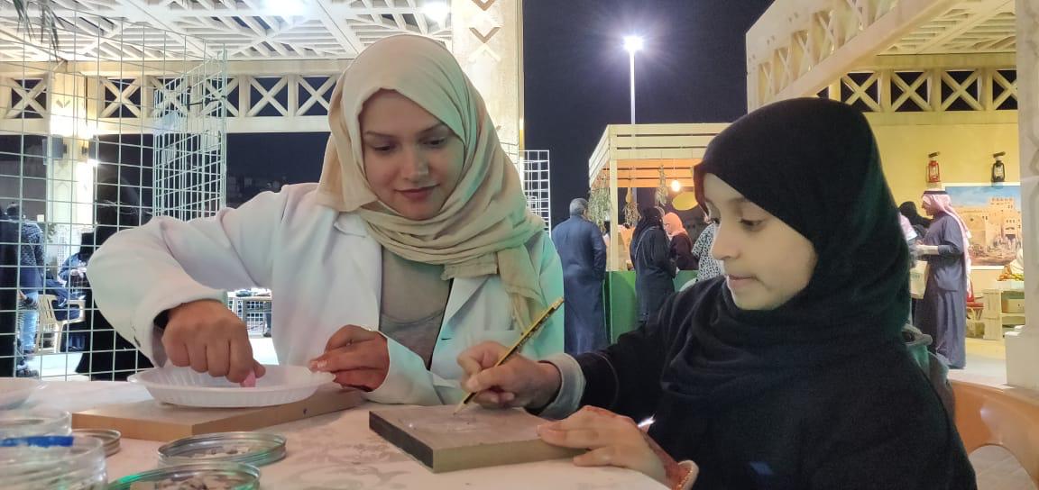 وبينت ماتقوم به في المهرجان من تعليم الأطفال ”ثقافة الفسيفساء“ من خلال عجينة خاصة وصمغ للسراميك، لصنع أشكال ”جميلة ومستدامة“.