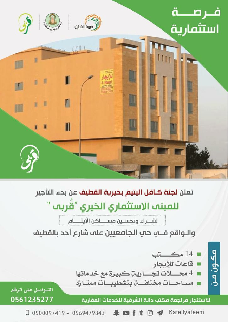 أعلنت لجنة كافل اليتيم بخيرية القطيف عن بدء تأجير مكاتب ومعارض المشروع الاستثماري الخيري ”قربى“ الذي تقوم عليه اللجنة ويصب ريعه في شراء وتحسين مساكن الأيتام، ويقع في حي الجامعيين على شارع أحد بالقطيف.