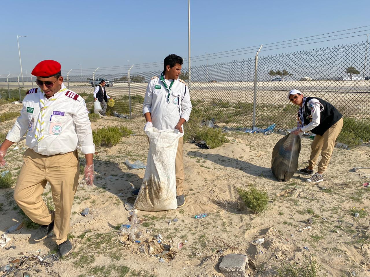 وقام الكشافة بجمع المخلفات البلاستيكية في بر المطار حيث تكثر المخلفات البلاستيكية.