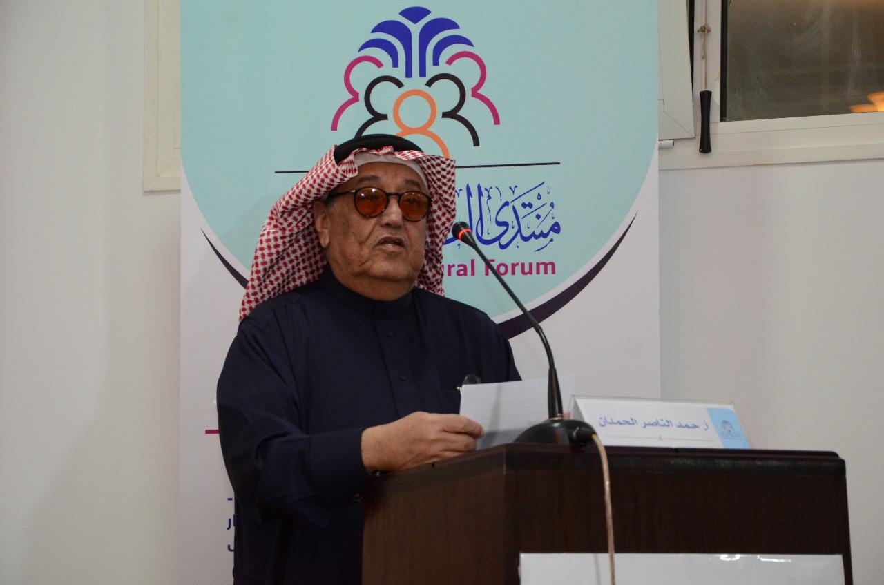 وأشاد ضيف شرف الامسية حمد الحمدان بجهود المنتدى المتواصلة في العطاء الثقافي، وناقش أبرز ما ورد في ورقة المحاضر من آراء .