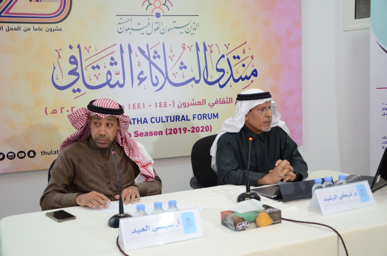 حاضر الأكاديمي ورجل الأعمال والاستاذ الزائر بجامعة اريزونا الدكتور تركي الفيصل الرشيد مساء امس الثلاثاء حول ”الإدارة الاستراتيجية في دول مجلس التعاون“، في ندوة بمنتدى الثلاثاء الثقافي حضرها جمع من المهتمين بالشأن الإداري والاقتصادي.