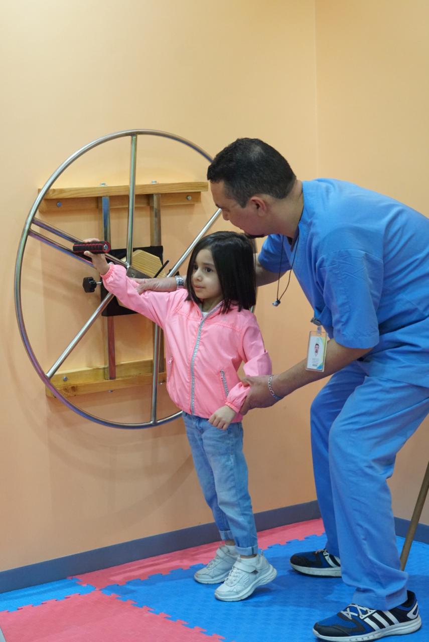 وقال: من شأن العلاج الطبيعي أن يحسن من قدرات الأطفال المصابين، ويجعله قادراً على التغلب على أحد جوانب العجز، أو القصور الناتجة عن الإصابة".