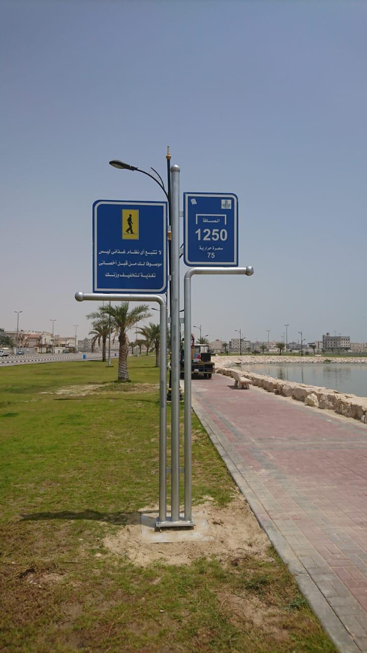 وتابع بالإضافة إلى ممشى شارع بلال بن رباح، وممشى شارع البيروني في مدينة صفوى، وحملت اللوحات التي جاءت باللونين الأزرق والأخضر في جانب منها مسافة المشي بالأمتار والسعرات الحرارية المفقودة من خلال مسافة المشي، بالإضافة إلى العبارات التحفيزية.