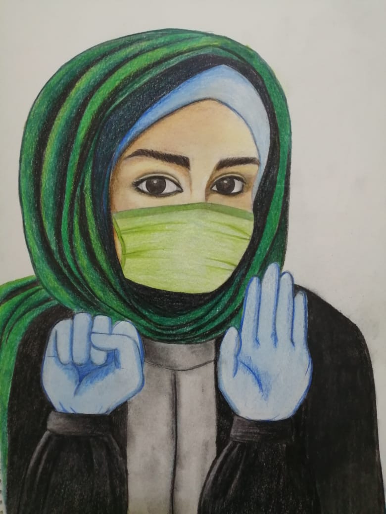 ورسمت التشكيلية نجلاء المؤمن لوحة لفتاة تعطي إشارة بيدها اليمنى ”طلب الابتعاد“ وباليد اليسرى ”دعوة للاتحاد“، هادفة منها إلى هزم «كورونا».
