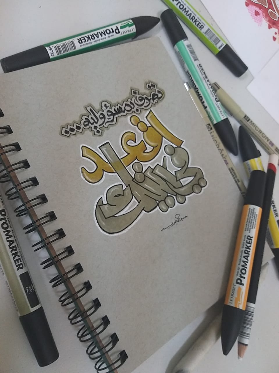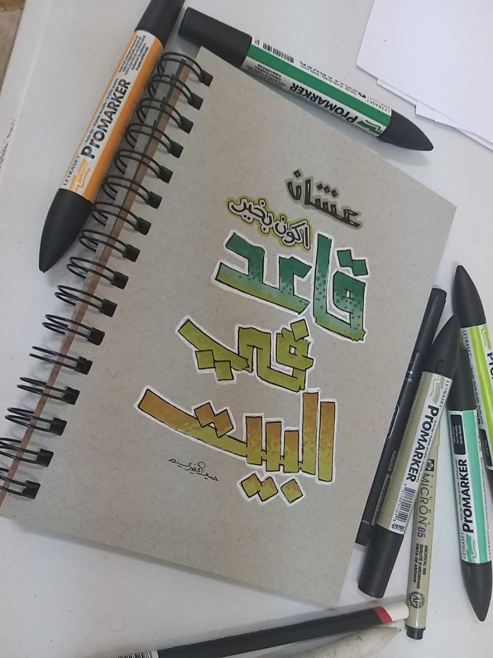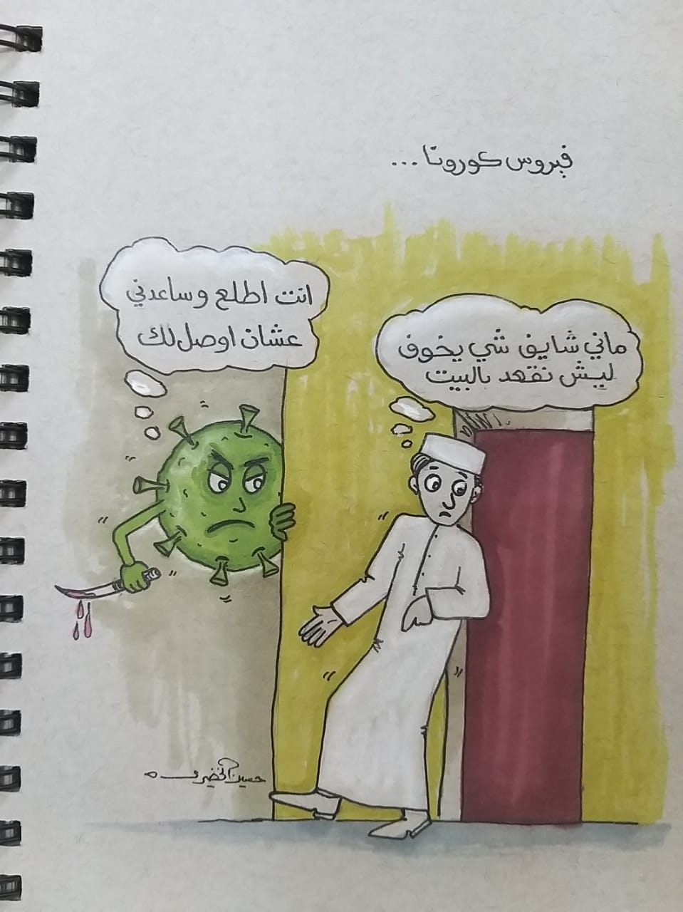 ودمج الفنان حسين الخضيري الخطوط العربية مع رسومات كاركاتيرية لكتابة شعارات وعبارات توعوية وتحذيرية من «كورونا» على كراسات مدرسية، مثل: ”لنتحد ضد فيروس كورونا“ و”تصرف بمسؤولية.. اقعد في بيتك“ و”عشان أكون بخير.. قاعد في البيت“.