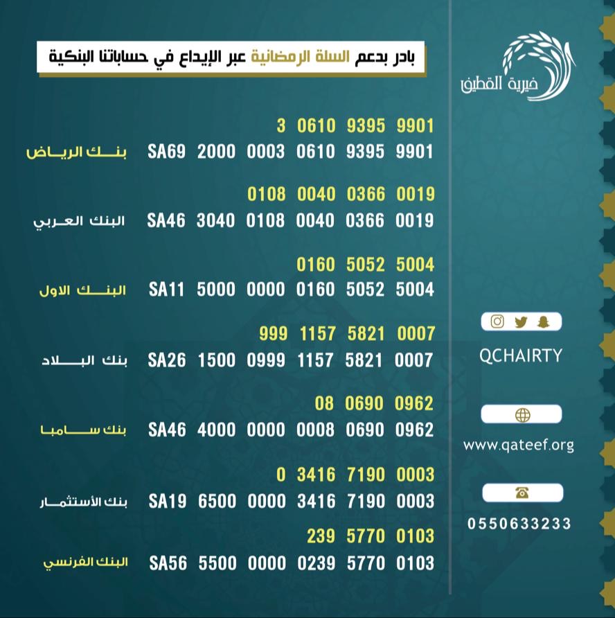 وقالت بأنه يمكن دعم السلة الرمضانية من خلال مكتب الجمعية بالقلعة من 9 صباحًا إلى 12 ظهرًا، أو الإيداع البنكي في حسابات الجمعية.