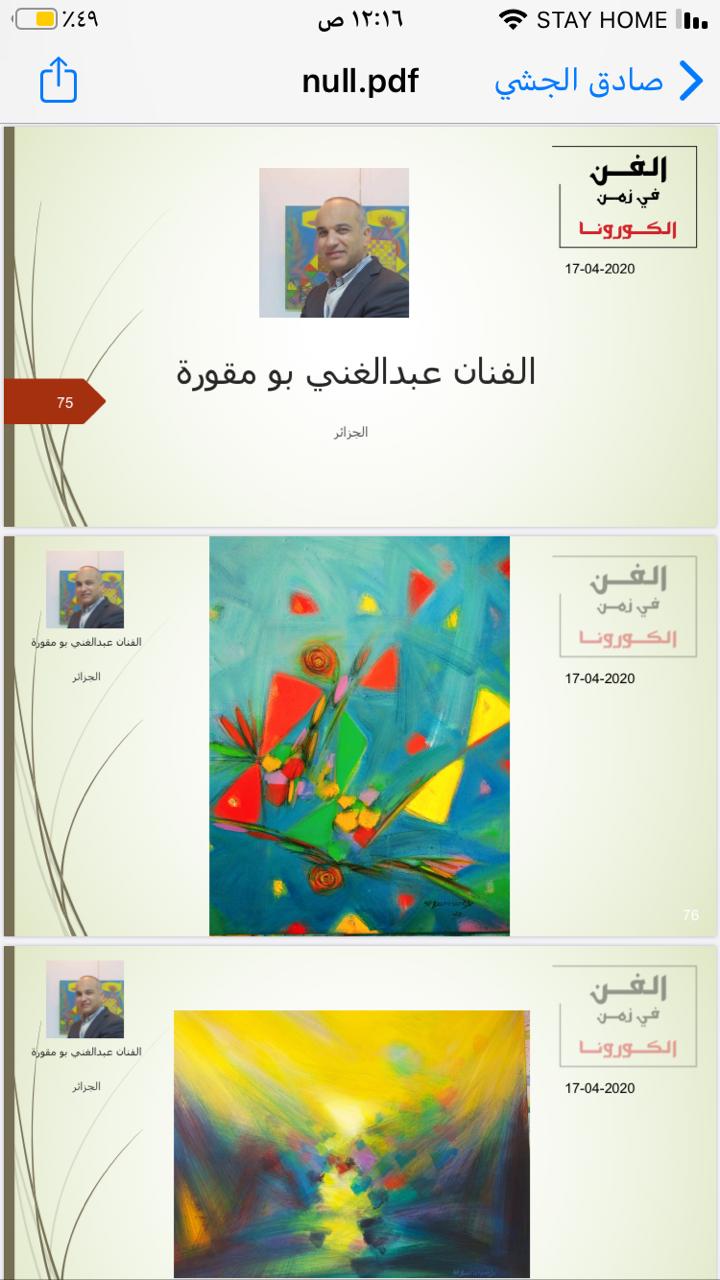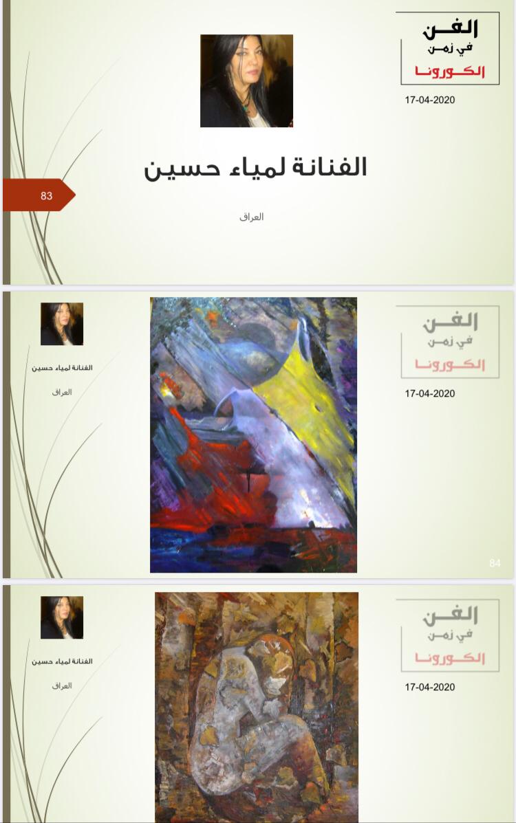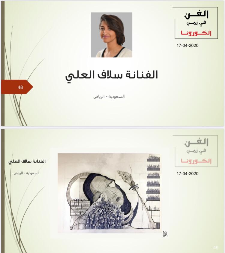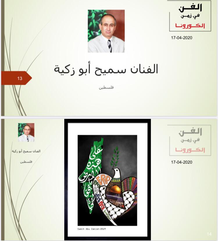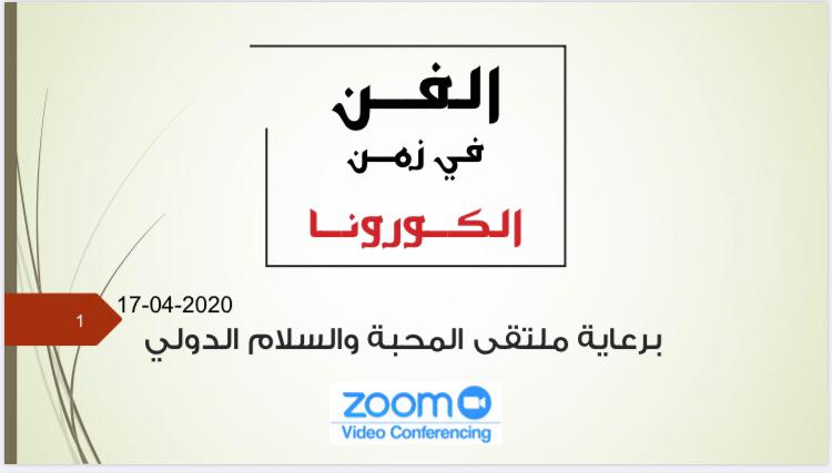 وأشار إلى مشاركة نخبة من الفنانين العرب بلغ عددهم 26 فنان وفنانة في المعرض الذي تم افتتاحه عبر تطبيق zoom، وتحدثوا فيه لساعتين عن ”تجاربهم الفنية في العزل المنزلي زمن الكورونا، وعرضوا فيه لوحاتهم“.