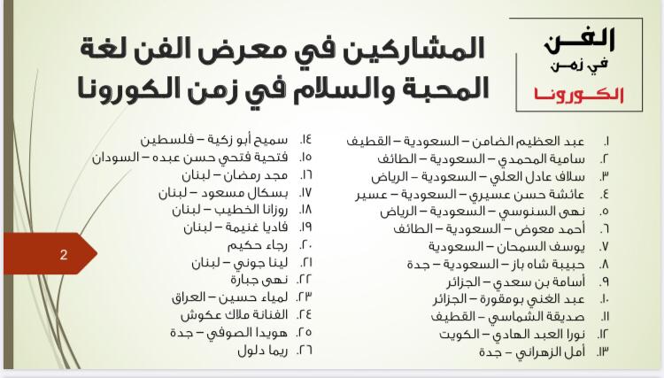 وافتتح الضامن المعرض بقوله ”اليوم نفتتح المعرض الدولي“ الفن لغة المحبة والسلام ”أول معرض في الفضاء الإلكتروني عبر تطبيق برنامج zoom، ندف من خلاله رسالة شكر لأبطال الصحة في العالم، وهم بالفعل أبطال الصف الأمامي في هذه الأزمة“.