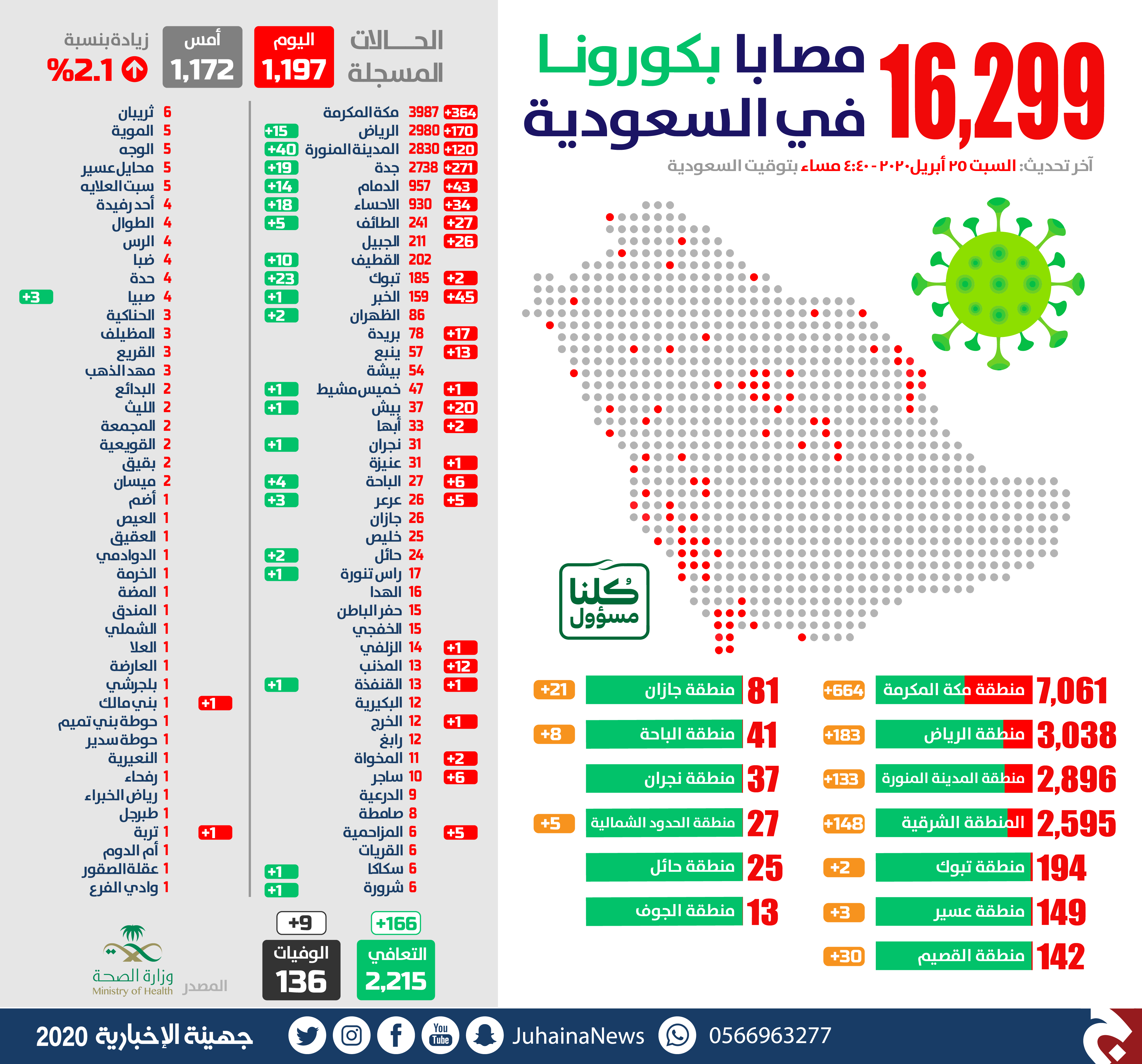 وجاءت مدينة الرياض المرتبة الأولى بين مدن المملكة في عدد المتعافين بواقع 725 حالة وجاءت في المرتبة الثانية مكة المكرمة بواقع 424 حالة، فيما احتلّت محافظة جدة المرتبة الثالثة في عدد المتعافين بواقع 294 حالة.