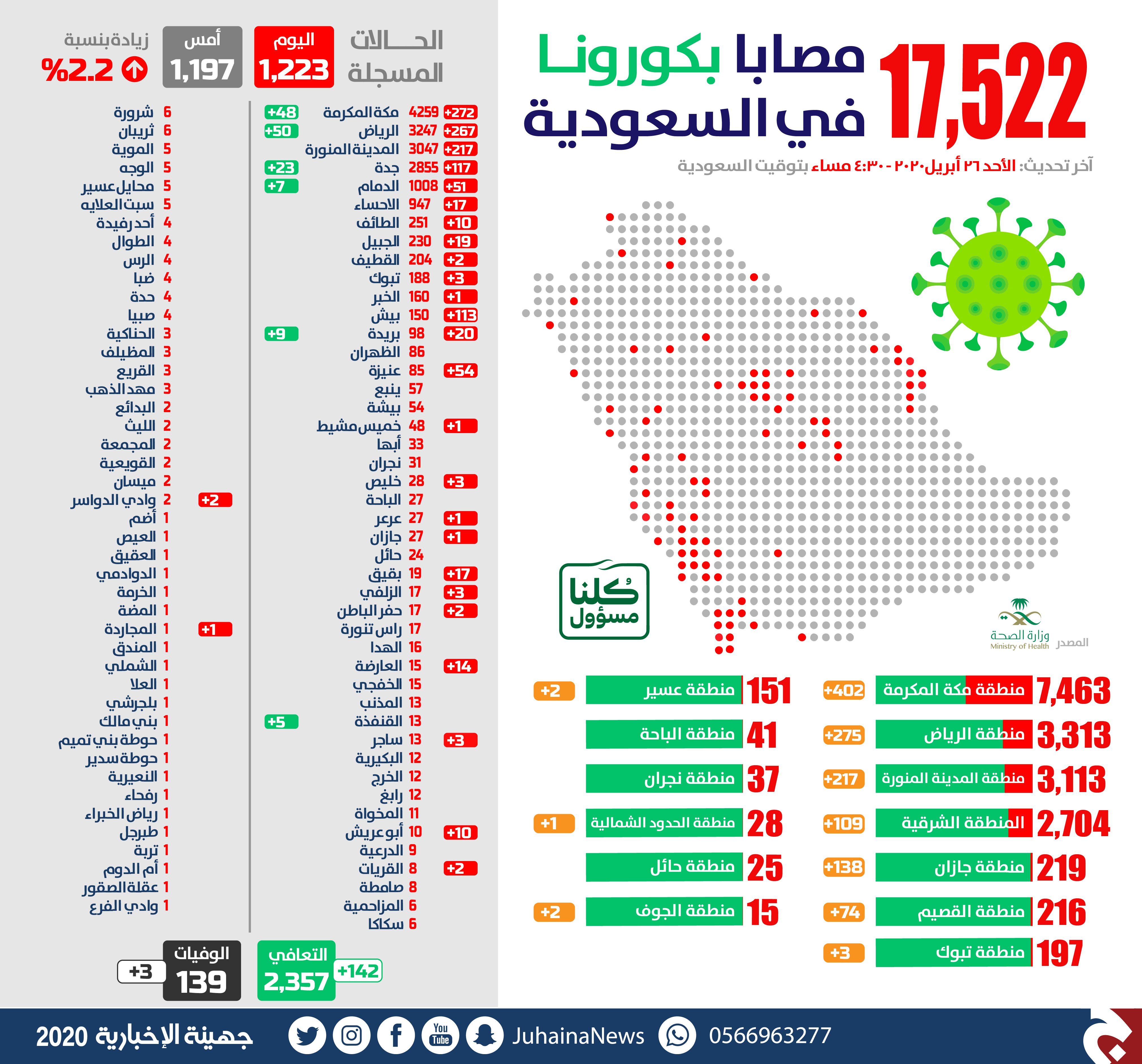 وتوزعت حالات الإصابة الجديدة بين مدن المملكة كالتالي: مكة المكرمة «272»، الرياض «267»، المدينة المنورة «217»، جدة «117»، بيش «113»، عنيزة «54»، الدمام «51»، بريدة «20»، الجبيل «19»، الهفوف «17»، بقيق «17»، العارضة «14»، الطائف «10»، أبوعريش «10»، خليص «3»، تبوك «3»، الزلفي «3»، ساجر «3»، القطيف «2»، حفر الباطن «2»، القريات «2»، وادي الدواسر «2»، المجاردة «1»، خميس مشيط «1»، الخبر «1»، جازان «1»، عرعر «1»، وبالتالي يصل إجمالي حالات الإصابة المؤكدة في المملكة إلى 17522 حالة، من بينها 15,026 حالة نشطة يستمر تلقيها للرعاية الصحية المناسبة، ومعظمها مستقرة ووضعها الصحي مطمئن، منها 115 حالة حرجة تتلقى الرعاية في العنايات المركزة المناسبة لحالاتها.