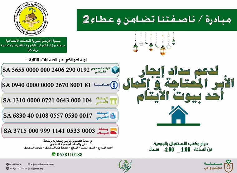 - يرجى «التحويل» عبر حسابات الجمعية المرفقة مع الإعلان مع إرسال رسالة عبر واتساب جوال الجمعية 0558110188 تتضمن اسم المتبرع، واسم البنك، والمبلغ المتبرع به، غرض التحويل «ناصفة رمضان - مسكن أيتام»، وصورة من سند التحويل.