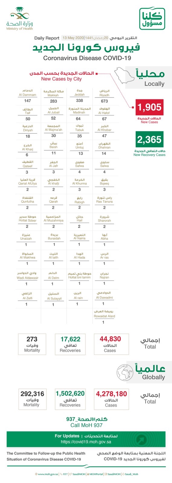 متحدث #وزارة_الصحة : في المملكة تم تسجيل 1905 حالة مؤكدة جديدة مصابة بفيروس #كورونا المستجد، توزعت في مختلف المدن والمناطق.