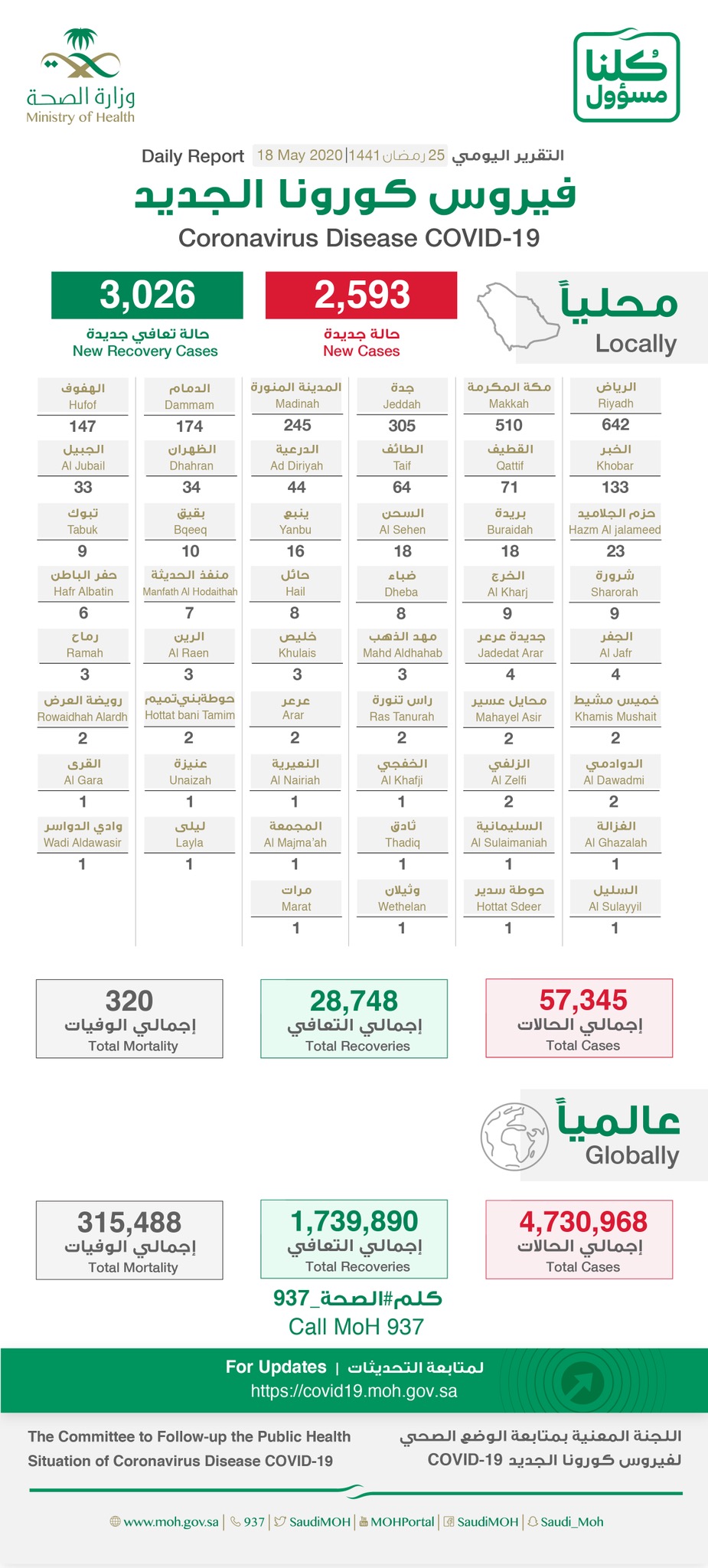 أعلن المتحدث باسم وزارة الدكتور محمد العبدالعالي، اليوم ”الأثنين“ تسجيل 2593 إصابة جديدة بفايروس كورونا المستجد ”كوفيد - 19“ في المملكة، منها 71 في القطيف.