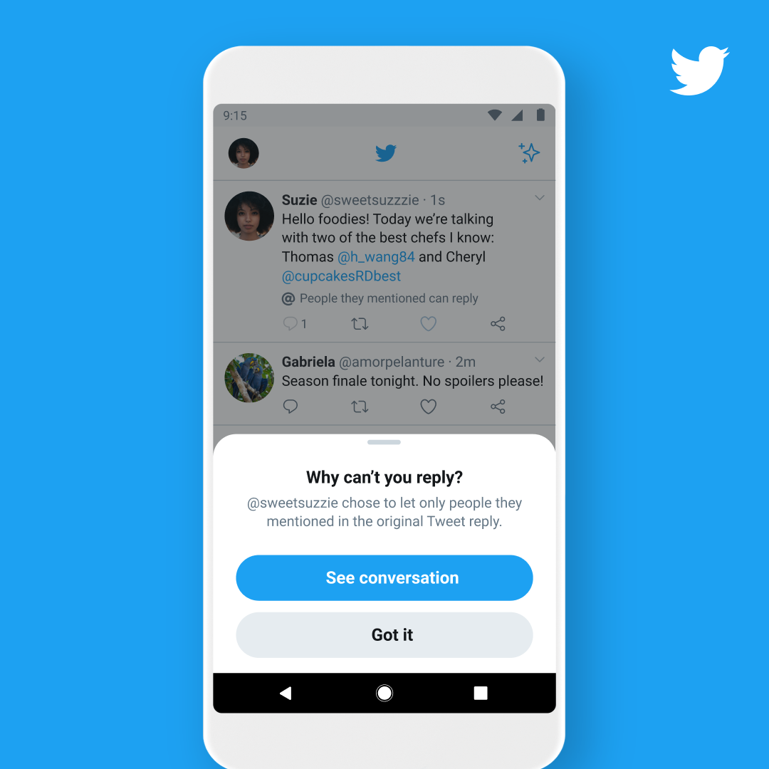 وقبيل نشر التغريدة، سيُظر ”توتير“ نافذة من ثلاثة خيارات وهي: «الكل - المُتَابعين - الأشخاص المشار إليهم فقط»، وذلك لتحديد من يمكنه التعليق أو الرد على التغريدة.