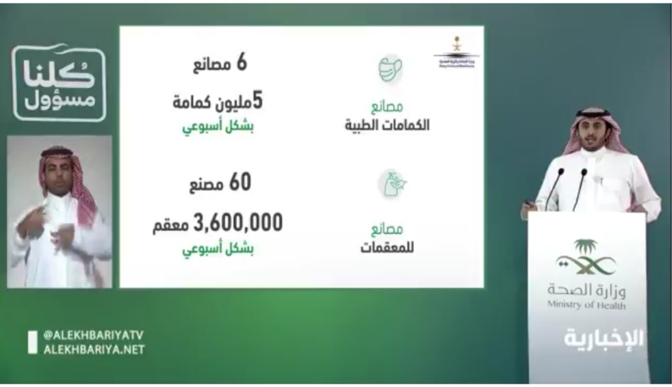 كشف المتحدث باسم وزارة الصناعة والثروة المعدنية مازن الحماد عن وجود 6 مصانع للكمامات الطبية، و60 مصنعاً للمعقمات، وتوفير 5 ملايين كمامة بشكل أسبوعي، وتوفير 3,600,000 معقم بشكل أسبوعي داخل المملكة.