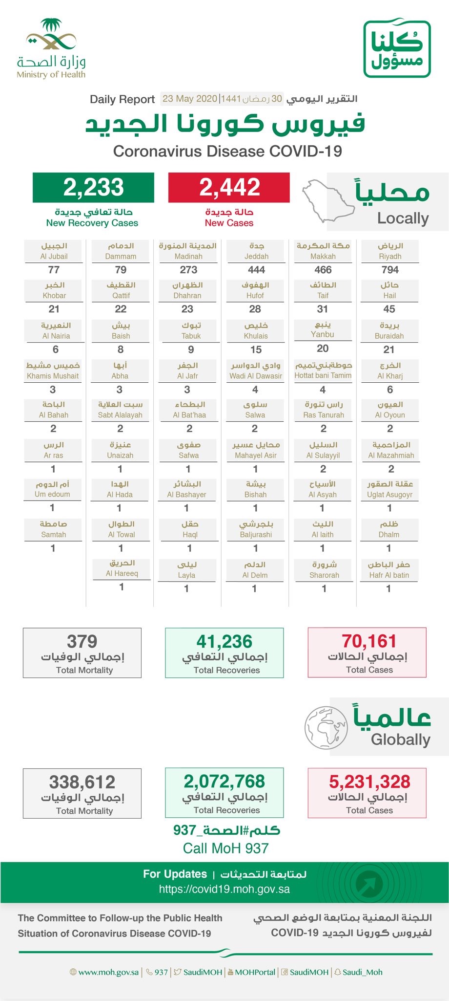 الصحة: تسجيل 2442 إصابة جديدة بكورونا.. منها 22 إصابة في القطيف و1 بصفوى