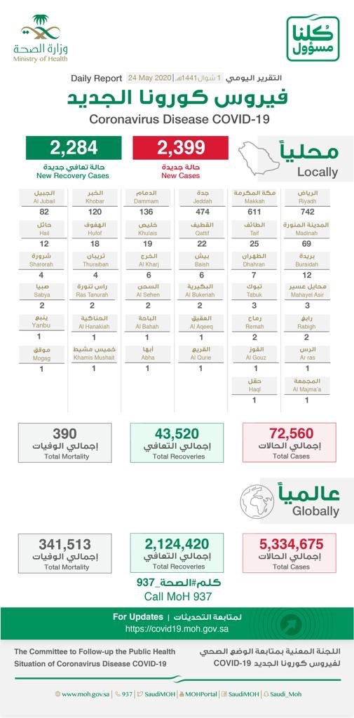 - تسجيل 2284 حالة تعافٍ جديدة منها 19 في القطيف و7 بصفوى، لترتفع الحالات الإجمالية للتعافي إلى 43520 حالة (60 % من إجمالي الإصابات المسجلة).