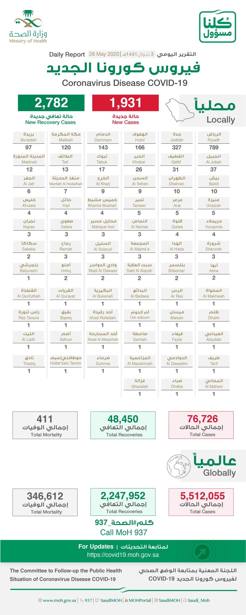 وتوزعت حالات الإصابة بين مدن المملكة كالتالي: الرياض (789)، جدة (372)، الهفوف (166)، الدمام (143)، مكة المكرمة (120)، بريدة (97)، الجبيل (37)، القطيف (31)، الخبر (26)، تبوك (17)، الطائف (13)، المدينة المنورة (12)، بيش (10)، الظهران (10)، السحن (9)، الخرج (9)، منفذ الحديثة (7)، الجفر (6)، عنيزة (5)، عرعر (5)، تمير (5)، خميس مشيط (4)، حائل (4)، خليص (4)، حريملاء (4)، قلوة (4)، النماص (3)، محايل عسير (3)، صفوى (3)، نجران (3)، شرورة (3)، الهدا (3)، المجمعة (3)، السليل (3)، رماح (3)، سكاكا (2)، أبها (2)، بللسمر (2)، سبت العلاية (2)، وادي الدواسر (2)، أملج (2)، بلجرشي (1)، المخواة (1)، الرس (1)، البدائع (1)، البكيرية (1)، القريات (1)، القنفذة (1)، ظلم (1)، ميسان (1)، أم الدوم (1)، أحد رفيدة (1)، بقيق (1)، راس تنورة (1)، العيدابي (1)، فيفاء (1)، صامطة (1)، أحد المسارحة (1)، أضم (1)، الليث (1)، طريف (1)، الدوادمي (1)، المزاحمية (1)، ضرماء (1)، حوطة بني تميم (1)، ثادق (1)، المحاني (1)، ضباء (1)، غزالة (1).