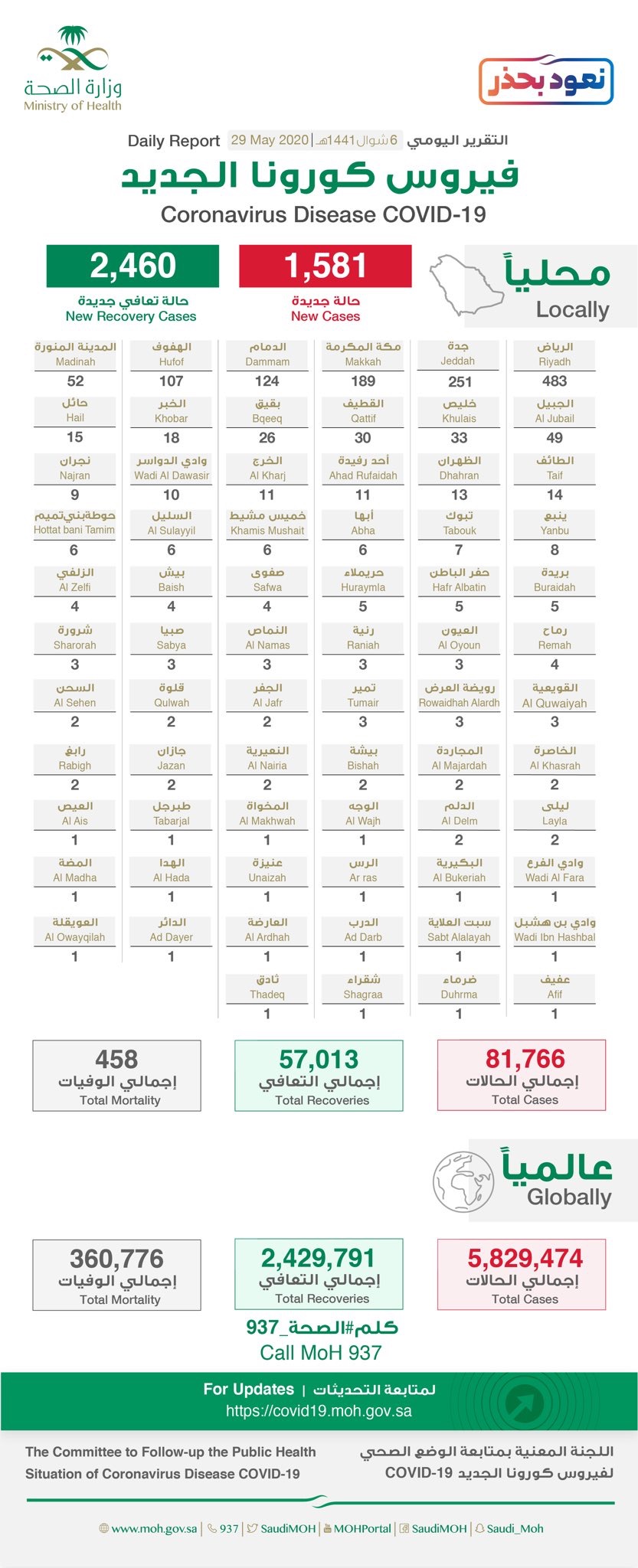 وتم تسجيل 2460 حالة تعافٍ جديدة كأعلى عدد لحالات الشفاء اليومية منها 63 حالة في القطيف، لترتفع الحالات الإجمالية للتعافي إلى 57013 حالة (70 % من إجمالي الإصابات المسجلة).