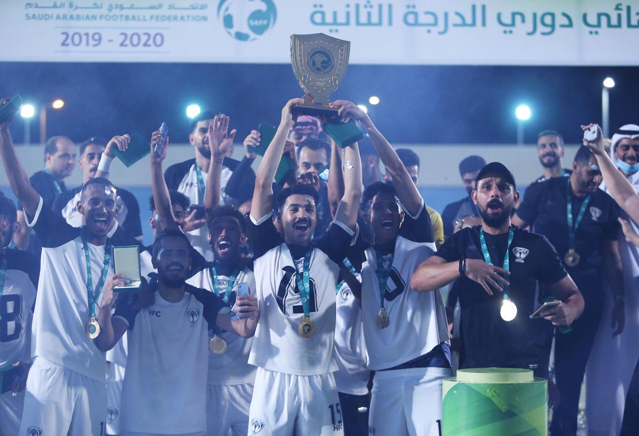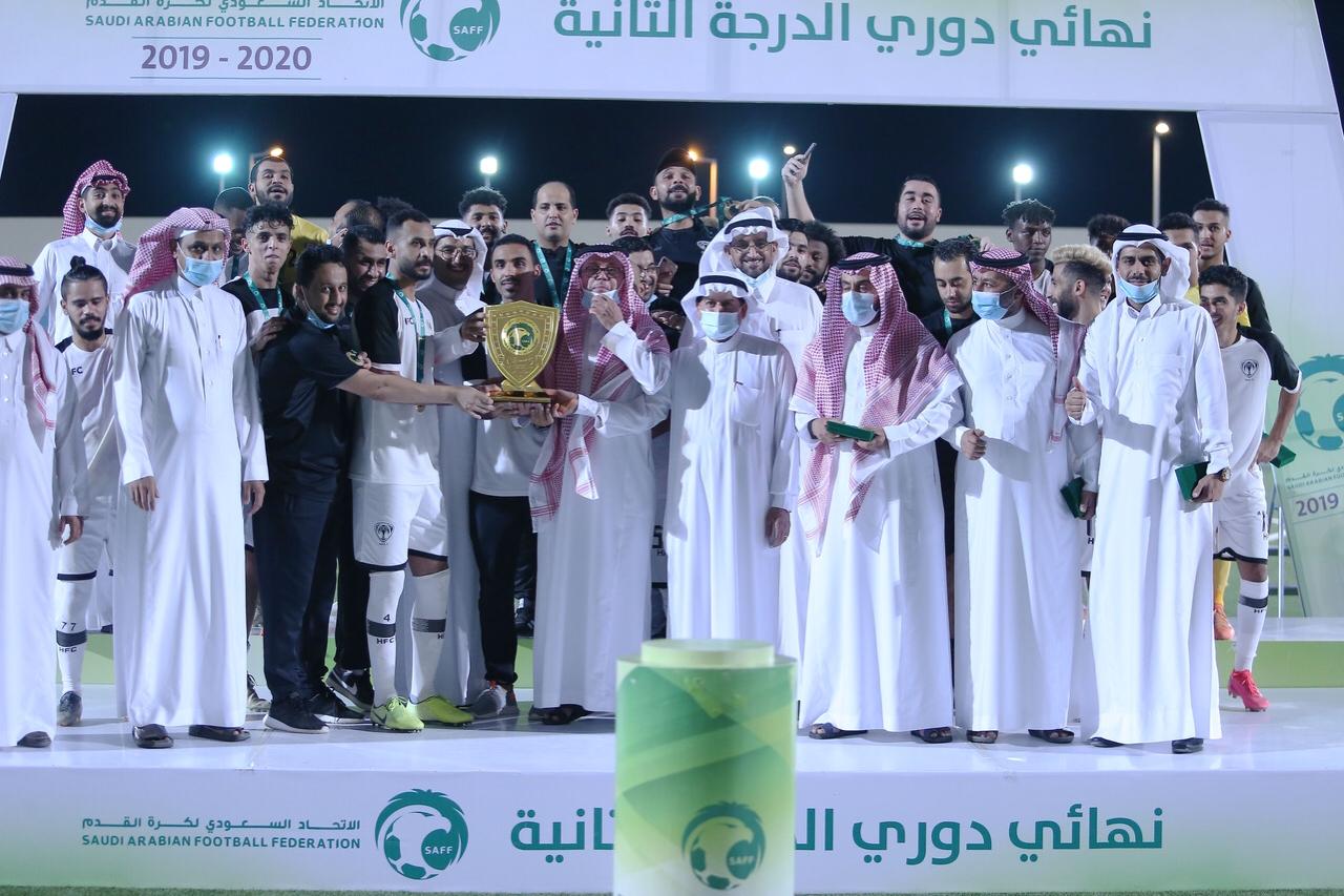توج عضوا مجلس إدارة الإتحاد السعودي لكرة القدم عبدالعزيز العفالق ونعيم البكر وممثل مكتب وزارة الرياضة بالاحساء أحمد الشواف، فريق هجر بدرع دوري الدرجة الثانية والميداليات الذهبية للموسم الرياضي 2019-2020، والميداليات الفضية لفريق الدرعية.
