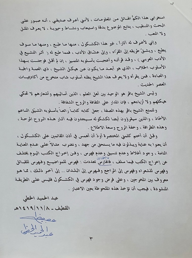 انتج هذا الجهد عن كشكول عدد صفحاته 485 صفحة سنة 1419 هـ . اقترح علي الأخ وابن العم المهندس رياض بن الشيخ باقر بوخمسين بأن نأخذ كشكول والده الى سماحة العلامة الشيخ عبد الحميد الخطي قاضي الأوقاف والمواريث بالقطيف حيث انه كان زميل دراسة وصحبة دامت نصف قرن مع سماحة العلامة الشيخ باقر بوخمسين فرحب بذلك وكتب فيه تقديم ضافي ”صورة # 6“ ومما جاء فيه: ”إن لم يأتي هذا الكشكول في المقدمة فإنه لا يأتي في المؤخرة ومما جاء فيه“ وقد قرأته وأعجبت بأسلوبه المتميز، إن لم أقل فوجئت بهذا الأسلوب الخلاب، الذي هو أبعد ما يكون عن هيكل الشيخ ذي العمة والجبة والعباءة، فمن يقرأ ولا يعرف الشيخ يظنه أسلوب شاب متخرج من أكاديميات العصر الحديث.