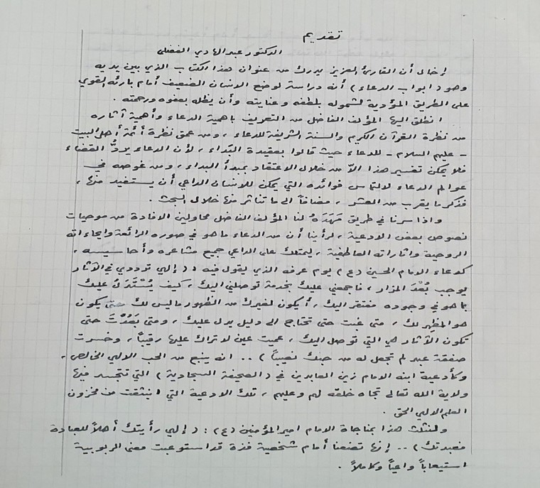 طبعا لم تكن المصادر متوفرة مثل اليوم. ولكن العزم والجد يجعل العسير يسيرا والله يوفق في مثل هذه الأمور. انتهيت من بحثي سنة 1415 هـ وعرضت الكتاب على أحد طلبة العلوم ليكتب لي مقدمة له فأرجع لي البحث ومن ورائه ابتسامة ساخرة ولكن لم يفت ذلك في عضدي فعرضت البحث على آية الله الدكتور عبدالهادي الفضلي فقدم له مشكورا مقدمة تليق بالكتاب وانا ممنونا له وأعتبرها تاجا على رأسي اذ أنه من الرواد في تشجيع النشأ والجيل الجديد، ومما جاء في مقدمته ”صورة # 1“: ”وإن دراسة الدعاء في ظلال معرفة فلسفته وتعرّف آدابه والوقوف على آثاره النفسية نمط مهم من الدراسة تقتضيه متطورات الحياة المعاصرة بما تزخر به من عوامل جَرَّ الإنسان إلى الماديات جزاً عنيفاً، وذلك لنكون بمستوى الكلمة الداعية، وفي طريق أداء رسالتنا الإسلامية العادلة. هذا ما دعا المؤلف للقيام بهذه الدراسة الموفقة“.
