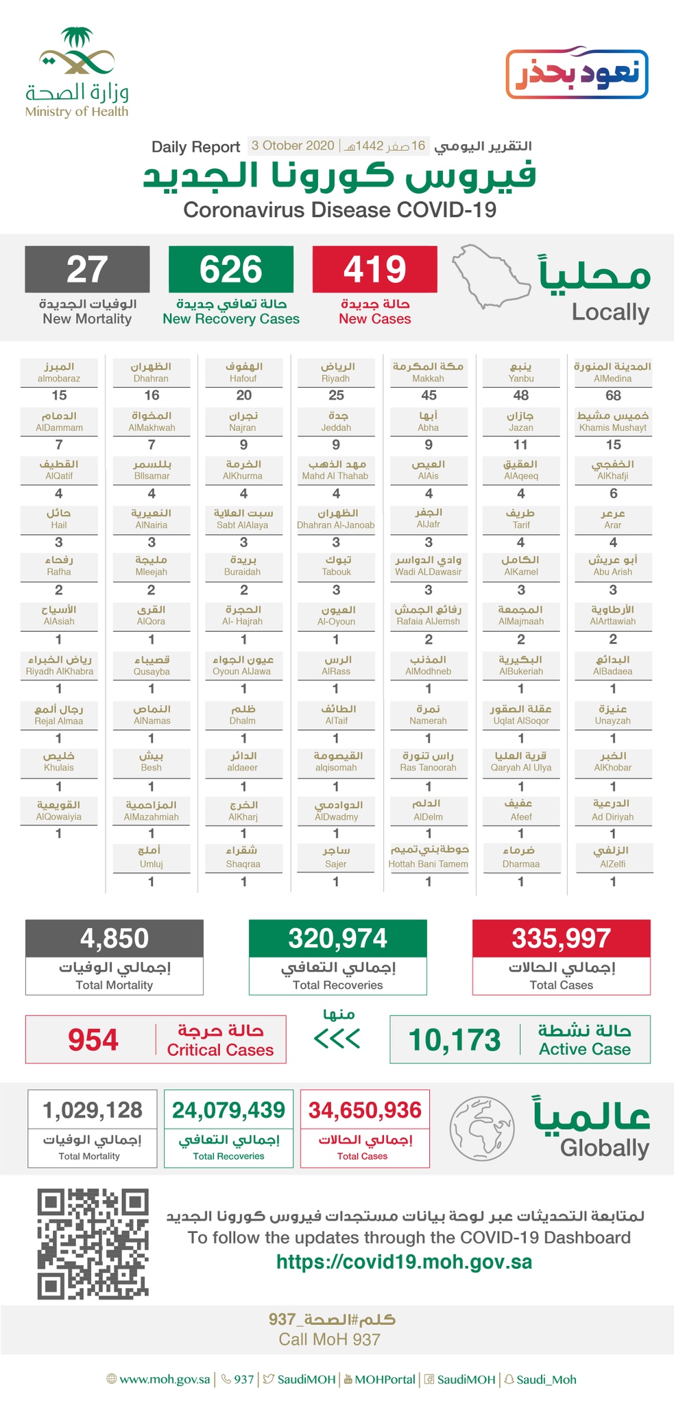 وبينت انه تم تسجيل ”626“ حالة تعافي جديدة منها 5 حالات في القطيف، ليصل عدد المتعافين إلى ”320974“ حالة. «95% من إجمالي الإصابات المسجلة».