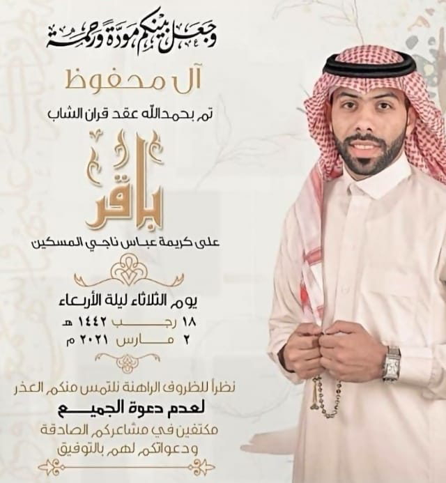 احتفلت عائلة آل محفوظ والمسكين في سيهات مساء يوم الثلاثاء بعقد قران الشاب باقر آل محفوظ على كريمة الحاج عباس ناجي المسكين وسط فرحة الأهل والأصدقاء ومحبي العريسين.