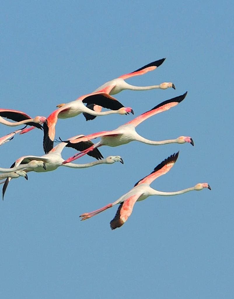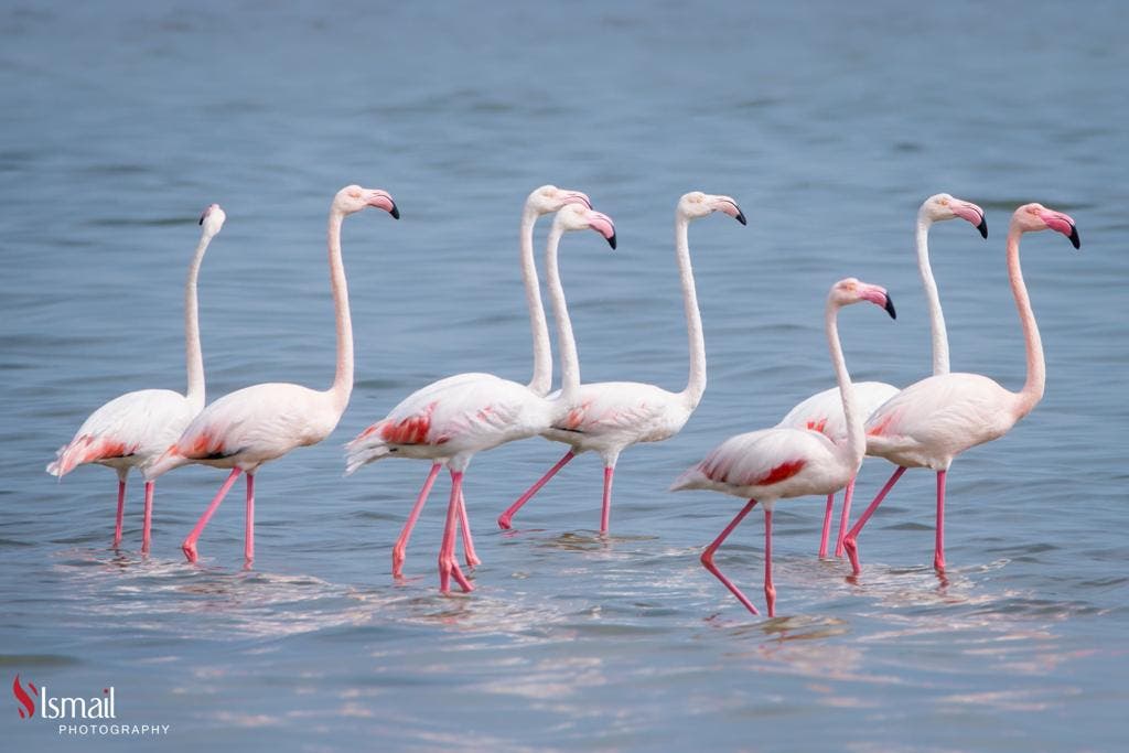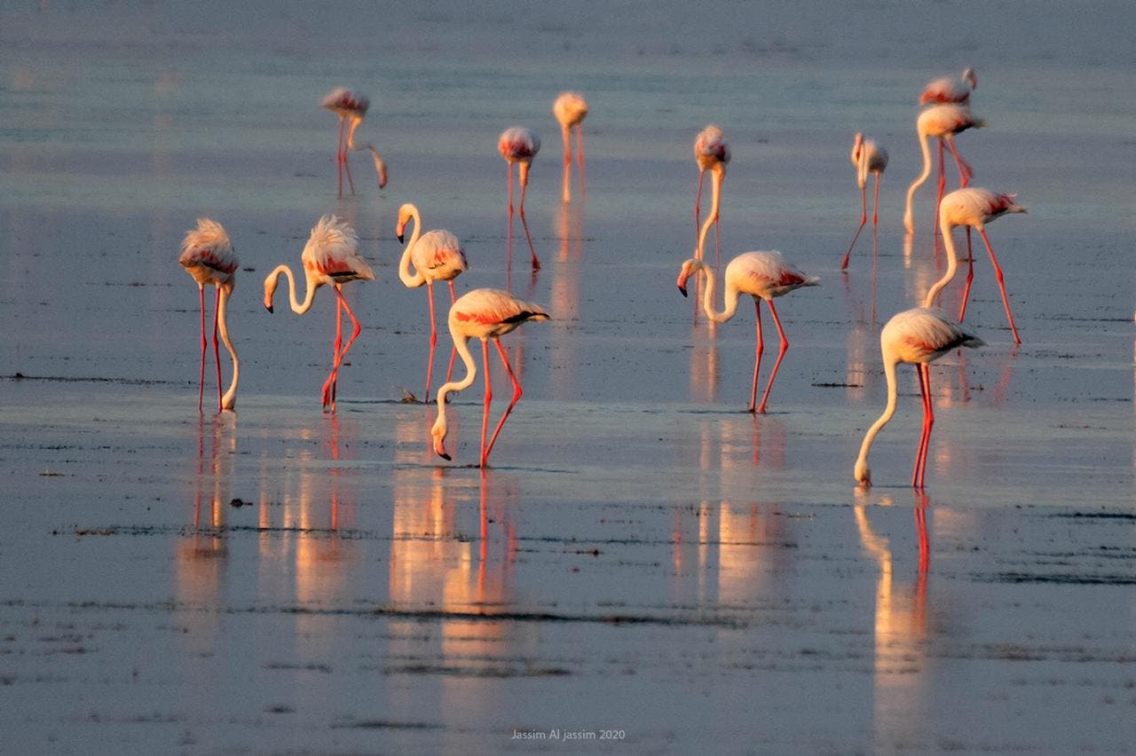 وتعد تجمعات الفلامنغو المعروف عربياً باسم ”النحام“ جاذبة لعدسة كل هاوي وراصد على سواحل الخليج العربي، بألوانها المتداخلة بين البياض واللون الوردي المكتسب من حميتها الغذائية المعتمدة على القشريات الوفيرة في المنطقة.