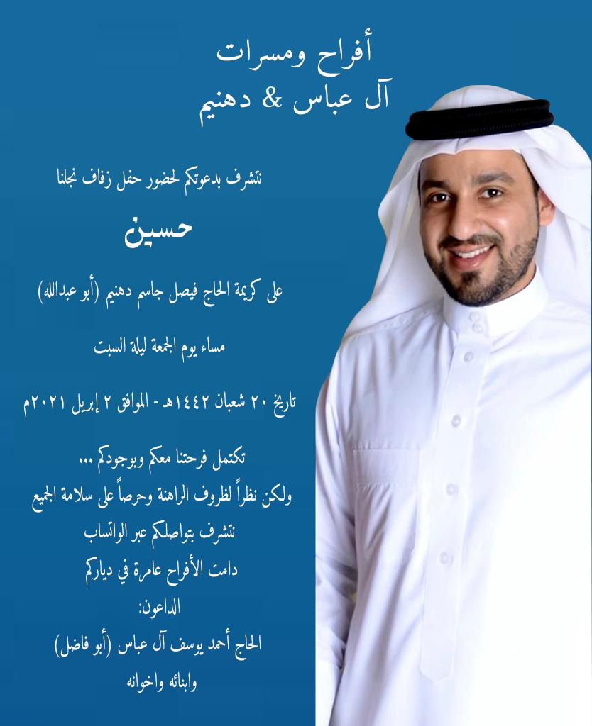 احتفلت عائلة آل عباس وآل دهنيم في القطيف مساء يوم الجمعة بزفاف الشاب حسين أحمد يوسف آل عباس على كريمة الحاج فيصل جاسم آل دهنيم وسط فرحة الأهل والأصدقاء ومحبي العريسين.