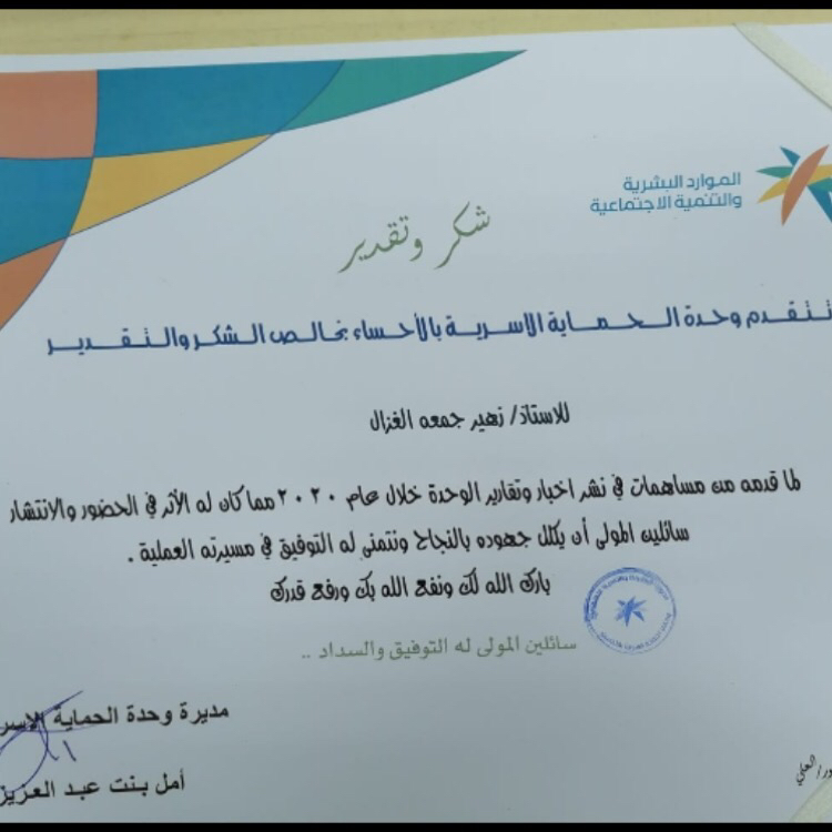 كرمت وحدة الحماية الاسرية بمحافظة الأحساء الزميل الإعلامي - زهير بن جمعة الغزال الاعلامي بالمنطقة الشرقية نظير جهوده الإعلامية في تغطية أنشطة وبرامج وفعاليات وحدة الحماية الاسرية بالأحساء.