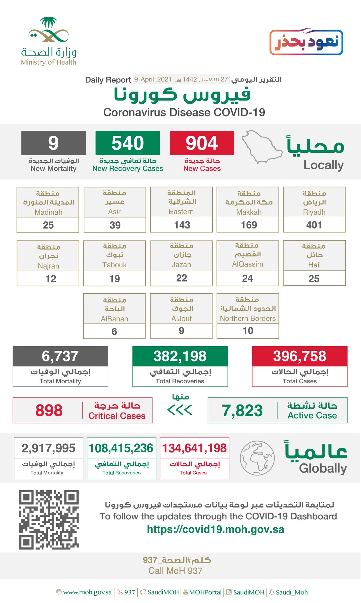 كما أعلنت الصحة عن تسجيل ”540“ حالة تماثلت للشفاء، ليصل مجموع المتعافين إلى ”382198“ حالة تعافي، فيما ارتفع إجمالي الوفيات في المملكة إلى ”6737“ حالة بعد تسجيل ”9“ حالة وفاة جديدة.