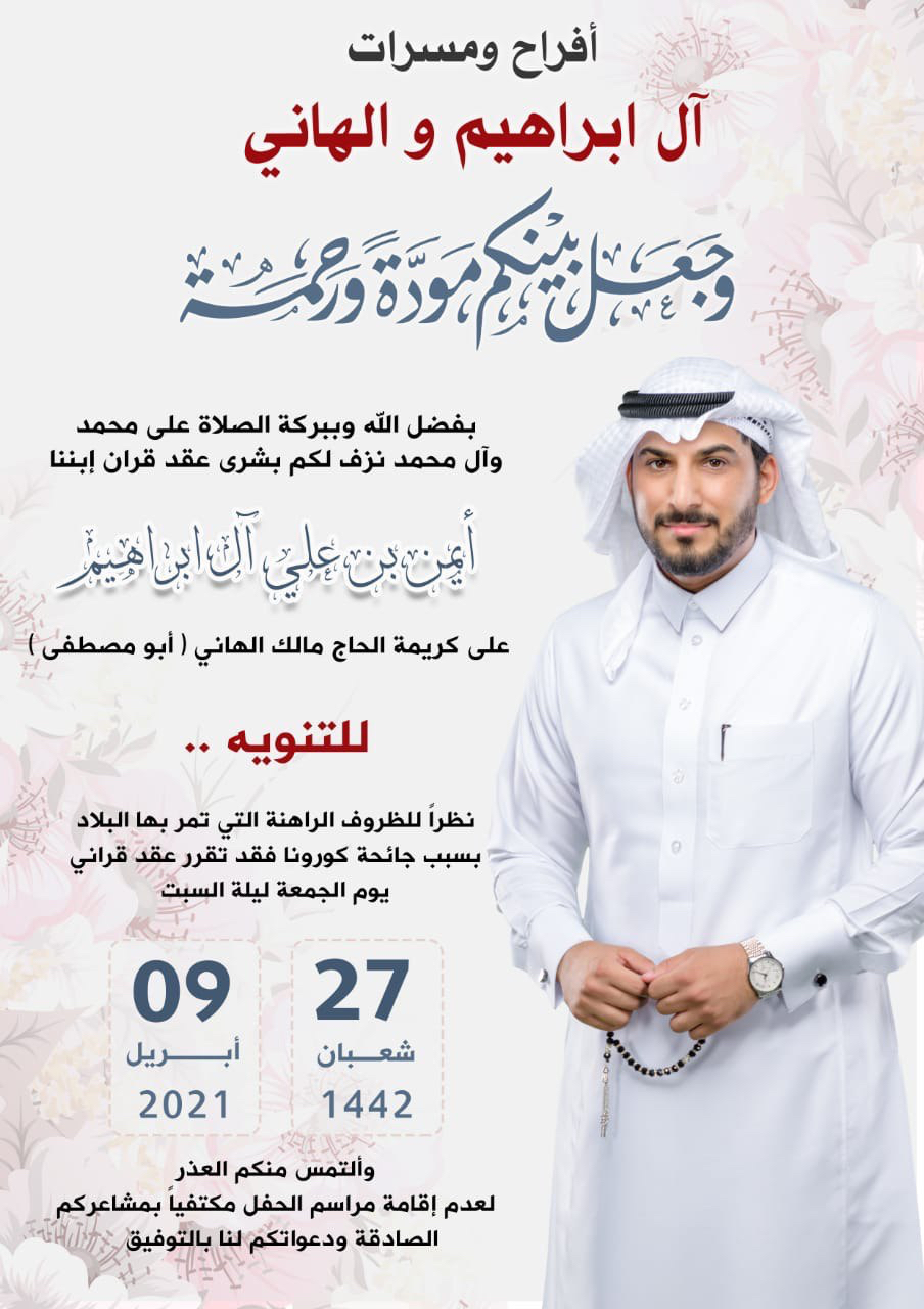 احتفلت عائلة آل ابراهيم والهاني في صفوى مساء يوم الجمعة بعقد قران الشاب أيمن علي آل ابراهيم على كريمة الحاج مالك الهاني «أبو مصطفى» وسط فرحة الأهل والأصدقاء ومحبي العريسين.