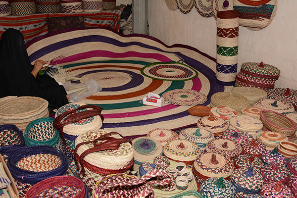 بعدها تحدثت العويش عن ألوان الخوص، وكيفية التعامل معها، ثم بدأت مع تعليم المستضافات كيفية صناعة أشكال متعددة من سلات وغيرها.