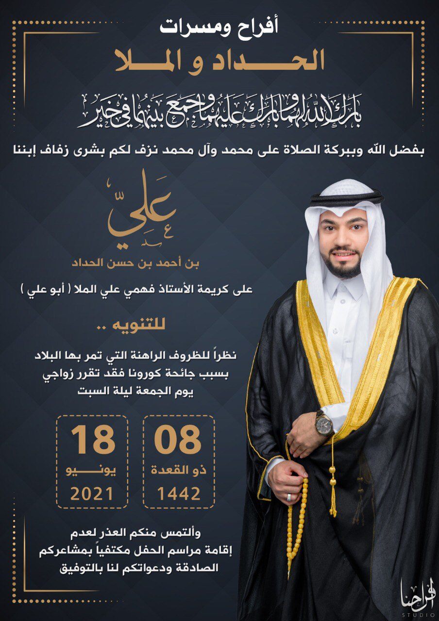 تحتفل عائلة الحداد والملا في صفوى مساء يوم الجمعة بزفاف الشاب علي أحمد حسن الحداد على كريمة الحاج فهمي علي الملا «أبو علي» وسط فرحة الأهل والأصدقاء ومحبي العريسين.