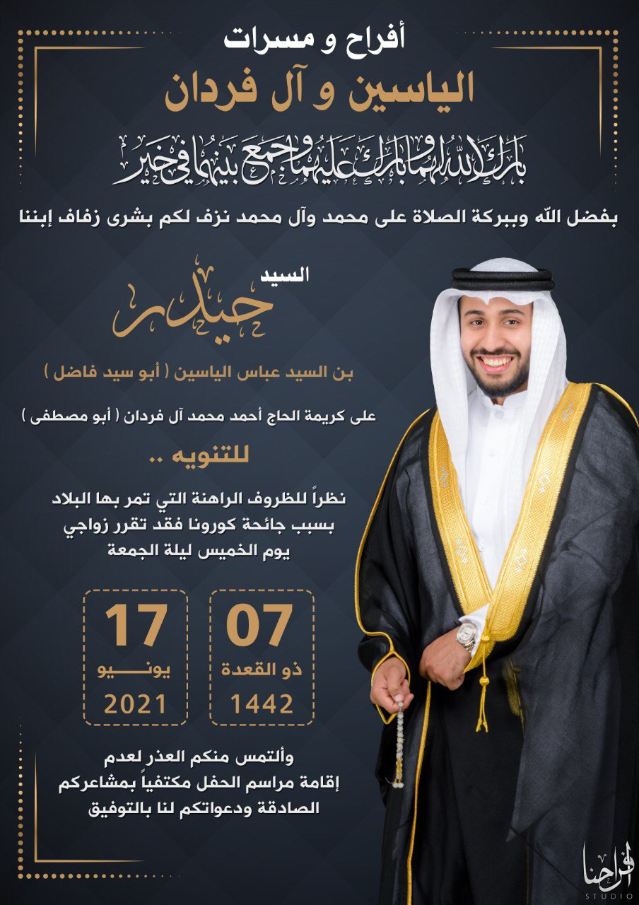 احتفلت عائلة الياسين وآل فردان في صفوى مساء يوم الخميس بزفاف الشاب السيد حيدر السيد عباس الياسين على كريمة الحاج أحمد محمد آل فردان «أبو مصطفى» وسط فرحة الأهل والأصدقاء ومحبي العريسين.