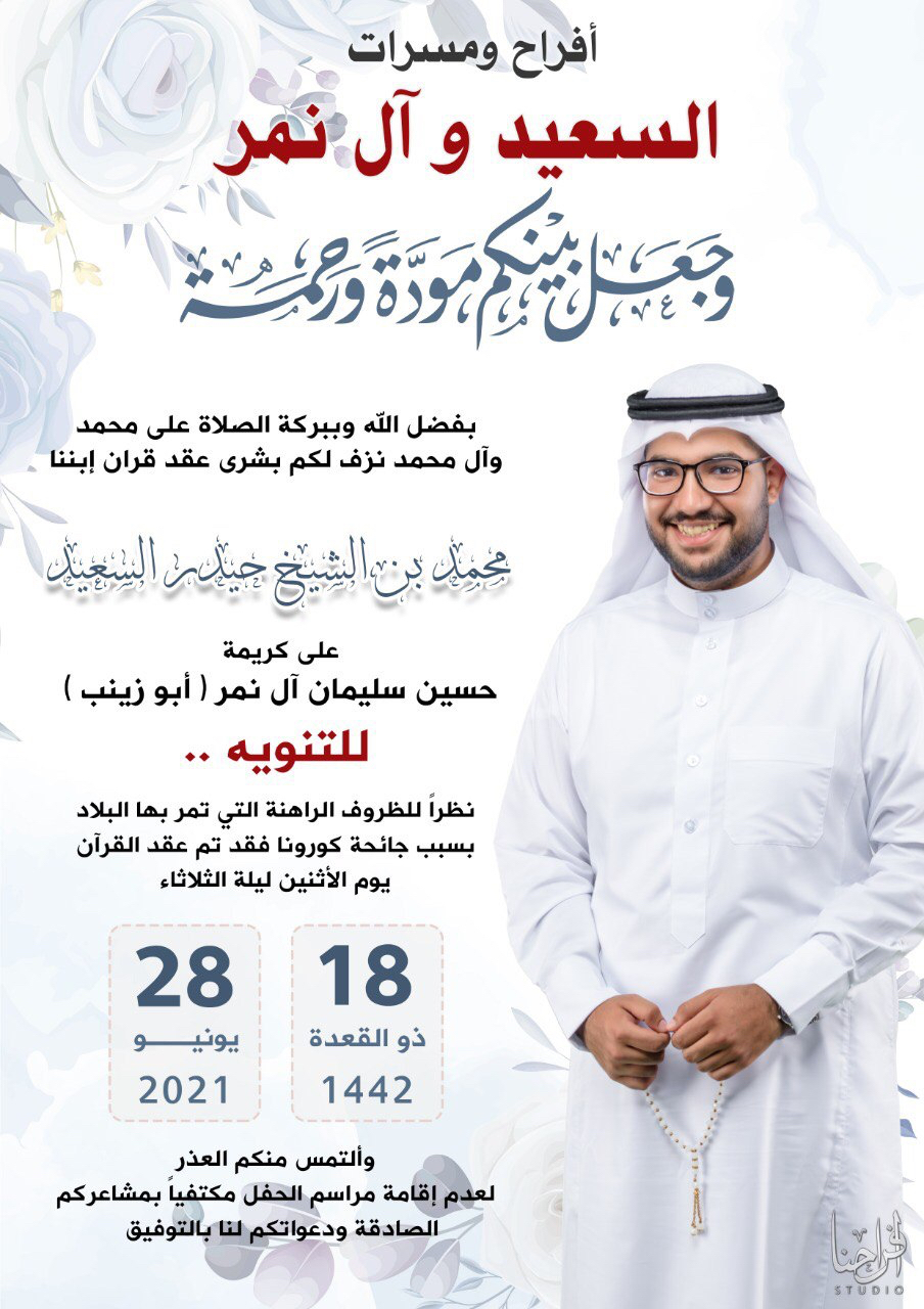 احتفلت عائلة السعيد وآل نمر في صفوى مساء يوم الإثنين بعقد قران الشاب محمد بن الشيخ حيدر السعيد على كريمة الحاج حسين سليمان آل نمر «أبو زينب» وسط فرحة الأهل والأصدقاء ومحبي العريسين.