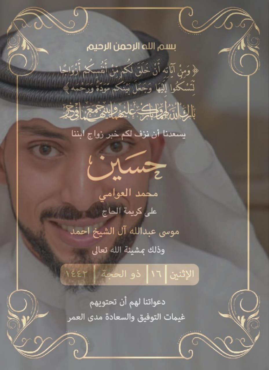 تحتفل عائلة العوامي وآل الشيخ أحمد مساء يوم الإثنين بزفاف الشاب حسين محمد العوامي على كريمة الحاج موسى عبدالله آل الشيخ احمد وسط فرحة الأهل والأصدقاء ومحبي العريسين.