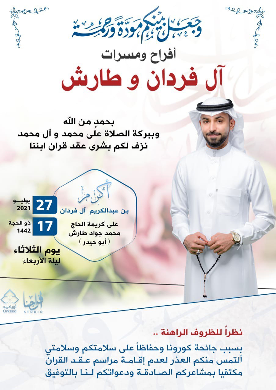 تحتفل عائلة آل فردان وطارش في صفوى مساء يوم الثلاثاء بعقد قران الشاب أكرم عبد الكريم آل فردان على كريمة الحاج محمد جواد طارش «أبو حيدر» وسط فرحة الأهل والأصدقاء ومحبي العريسين.