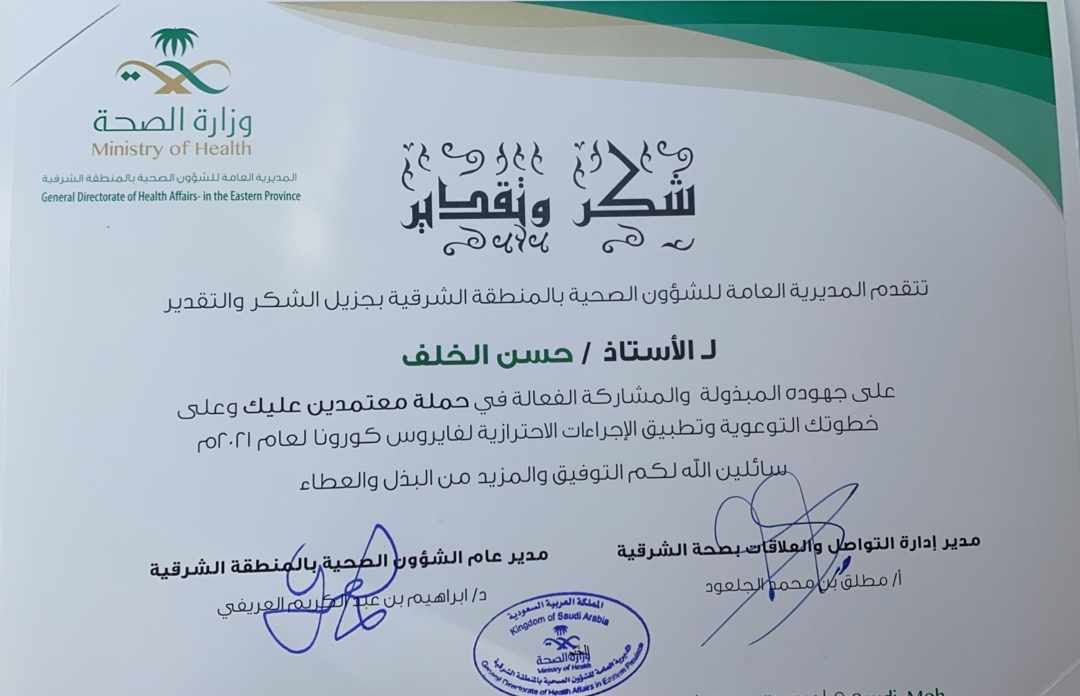 كرم الدكتور ابراهيم عبد الكريم العريفي مدير عام الشؤون الصحية بالمنطقة الشرقية الزميل في صحيفة جهينة الإخبارية حسن سعيد الخلف بشهادة شكر وتقدير نظير جهوده المبذولة والمشاركة الفعالة في حملة «معتمدين عليك» وعلى الخطوة التوعوية وتتطبيق الإجراءات الإحترازية لفايروس كورونا لعام 2021 م.