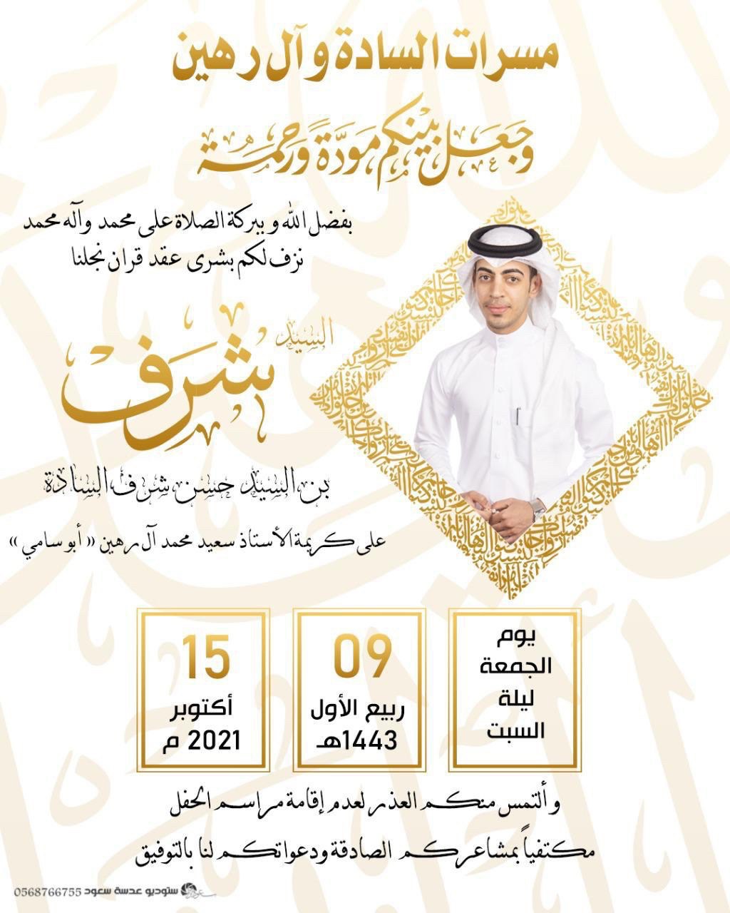 احتفلت عائلة السادة وآل رهين في صفوى مساء يوم الجمعة بعقد قران الشاب السيد شرف السيد حسن السيد شرف السادة على كريمة الحاج سعيد محمد آل رهين «أبو سامي» وسط فرحة الأهل والأصدقاء ومحبي العريسين.