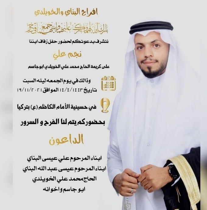 تحتفل عائلة البناي والخويلدي في القديح مساء يوم الجمعة بزفاف الشاب نجم علي عيسى عبدالله البناي على كريمة الحاج محمد علي الخويلدي في حسينية الإمام الكاظم بتركيا وسط فرحة الأهل والأصدقاء ومحبي العريسين.