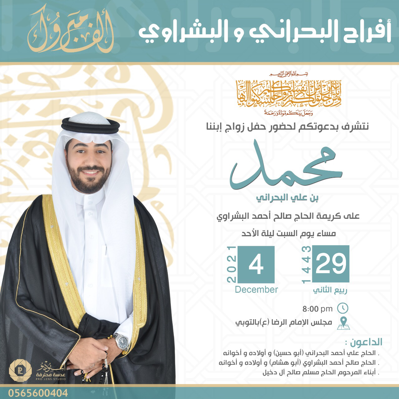 تحتفل عائلة البحراني والبشراوي في التوبي مساء اليوم السبت بزفاف الشاب محمد علي أحمد البحراني على كريمة الحاج صالح أحمد البشراوي في مجلس الإمام الرضا بالتوبي وسط فرحة الأهل والأصدقاء ومحبي العريسين.